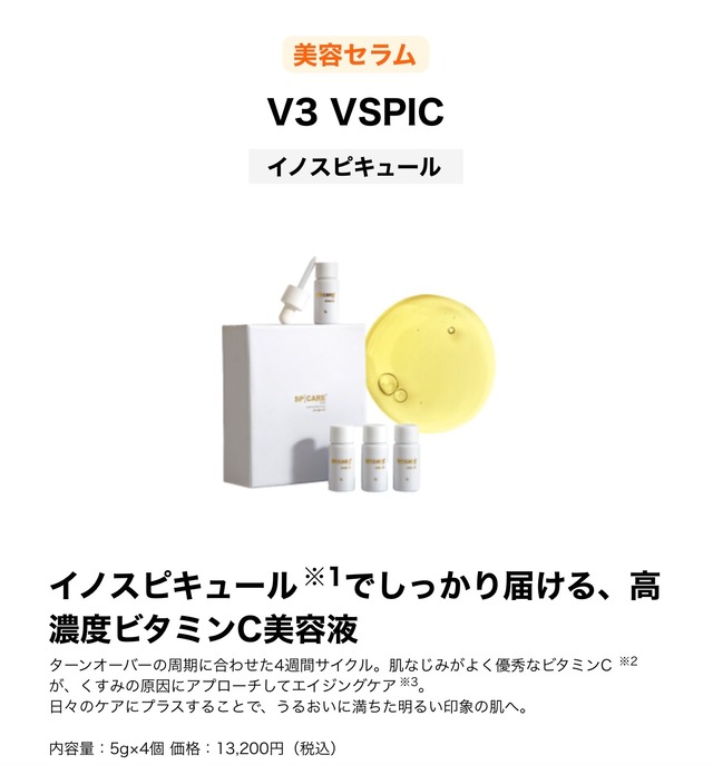V3 VSPIC C Line 新たなHARI×ビタミンC※1発想の V3スキンケアシリーズ V3ファンデーションで培った知見を 最大限に生かしたスキンケアシリーズ。 独自のHARI「イノスピキュール※2」から着想を得た、 さらなる可能性を引き出す HARI「グロウスピキュール※3」を新たに配合。 2種類のHARIが役割に応じて、 ビタミンC※1をしっかり肌へ届け※4、 弾むようなハリに満ちたみずみずしい肌へ導きます。 サロン級のケアを毎日、ご自宅で。 ※1 アスコルビン酸(保湿) ※2 加水分解カイメン(整肌) ※3 シリカ(整肌) ※4 角質層まで 特徴.01_ グロウスピキュール※1で サロン仕上がりのハリ肌へ 次世代のシリカ針「グロウスピキュール※1」 POINT.01_ 広い空洞と 多孔性の構造により、 より多くの有用成分が保持できる。 POINT.02_ 長さが短く均一なため、 チクチク感をほとんど感じないのも特長です。 ハイブリッド配合 イノスピキュール※2 ※1 シリカ(整肌) ※2 加水分解カイメン(整肌) ※3 角質層まで 特徴.02_ 2種類のHARI※1が ビタミンC※2を肌へ確実に届ける 安定させることが難しいビタミンC※2を 2種類のHARIに含有・コーティングすることで、 ビタミンCがフレッシュな状態で確実に肌へ届き、 時間をかけてゆっくり浸透※3。 あらゆる肌悩みにアプローチして、 なめらかでみずみずしいハリ肌へ導きます。 ※1 [イノスピキュール]加水分解カイメン(整肌)/ [グロウスピキュール] シリカ(整肌) ※2 アスコルビン酸(保湿) ※3 角質層まで ビタミンC のメリット 肌のキメを整える 肌にうるおいを与える 肌の弾力UP 肌を引き締め、 毛穴を目立たなくする 皮脂の分泌を抑える 肌荒れ予防 特徴.03_女性にうれしい パワフルな成分で エイジングサインにアプローチ 豊富なビタミンCはもちろん、 美肌をサポートするポリフェノールや βカロテンを含むサジーをはじめとした多様な有用成分が、 エイジングサインに多角的に働きかけ、 うるおいに満ちた健やかな肌へ整えます。 イノスピキュール※1でしっかり届ける、高濃度ビタミンC美容液 ターンオーバーの周期に合わせた4週間サイクル。肌なじみがよく優秀なビタミンC※2が、くすみの原因にアプローチしてエイジングケア※3。 日々のケアにプラスすることで、うるおいに満ちた明るい印象の肌へ。 内容量:5g×4個 価格:13,200円(税込) ※1 加水分解カイメン(整肌) ※2 アスコルビン酸(保湿) ※3 年齢に応じたケア ※ VSPICにはグロウスピキュール(シリカ)は配合されていません