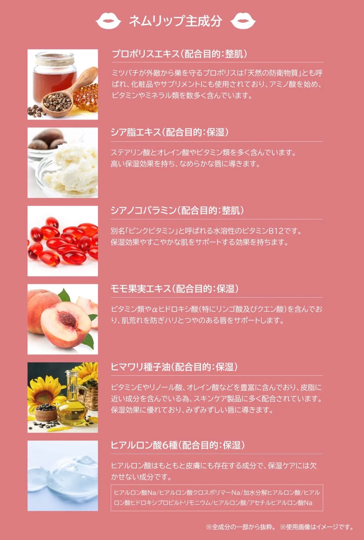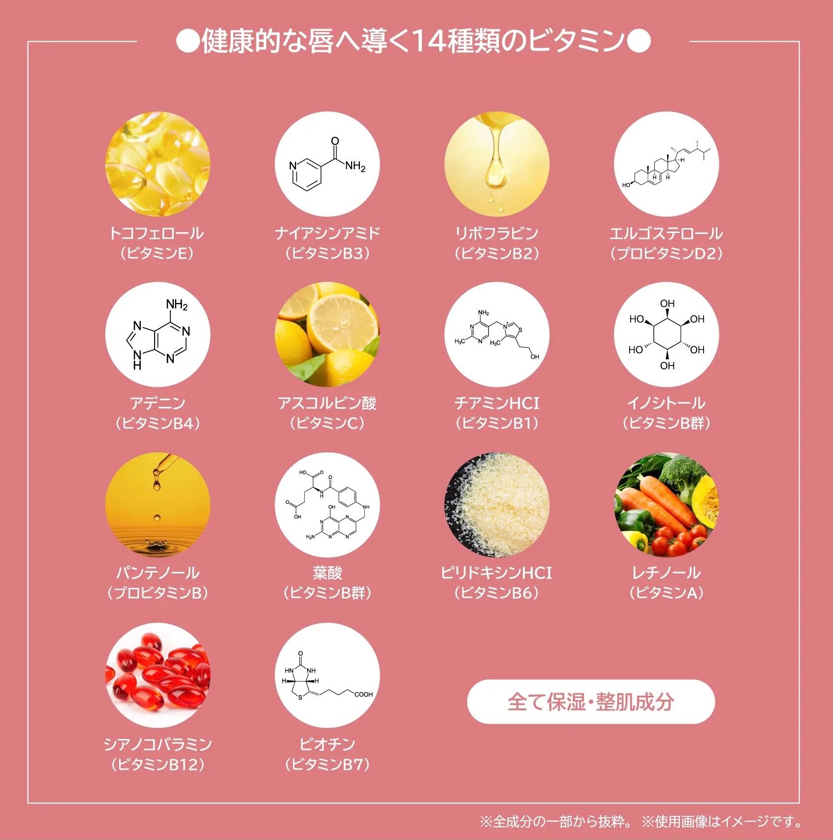 「ナチュラルビタミンE」や「ヒアルロン酸」が含まれており、ぷるぷるとした唇を実現。さらに、潤いを与えながら紫外線からも唇を保護しますので、安心して毎日のケアを行えます。