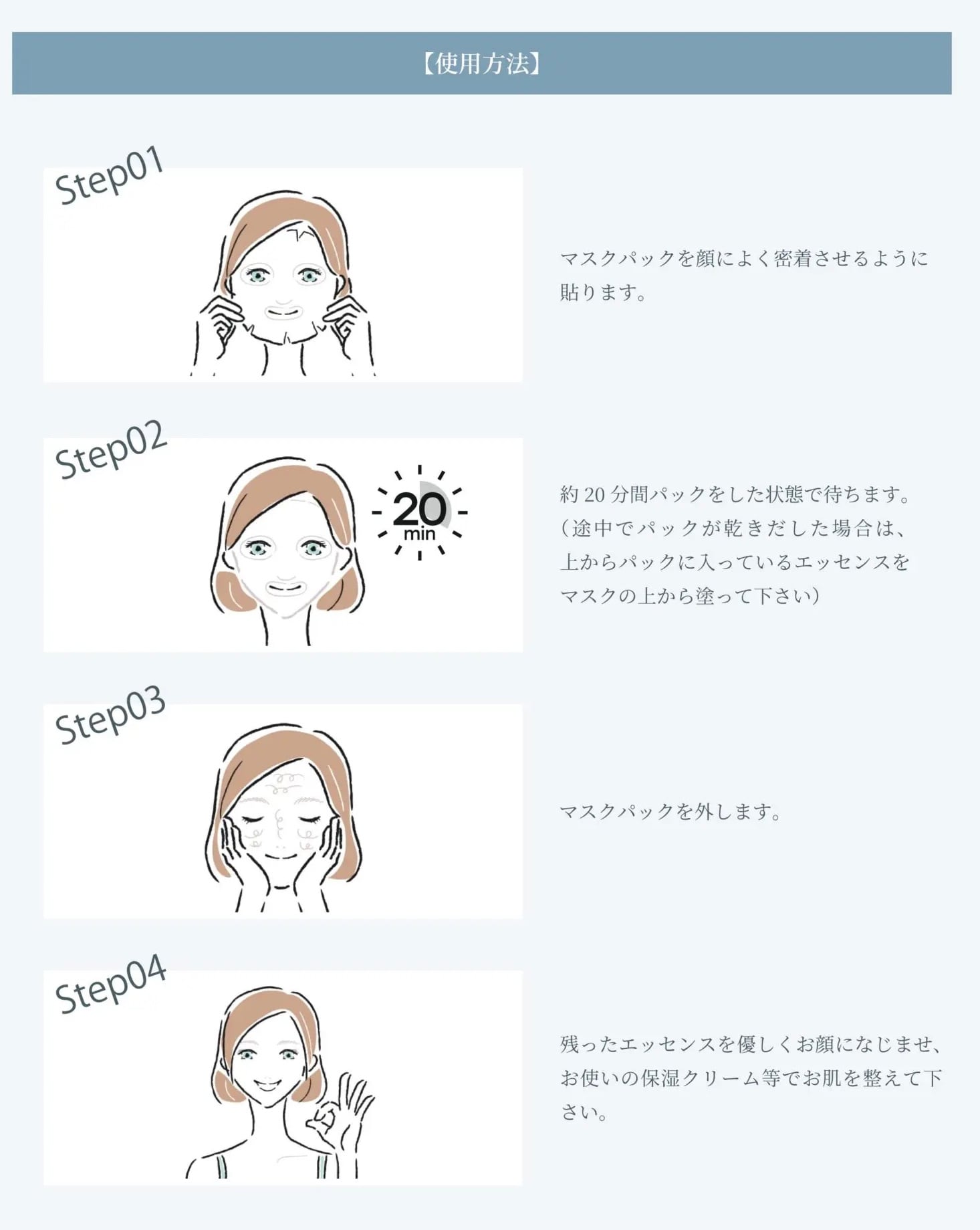 使用方法:洗顔後、マスクを取り出し顔全体になじませてください。約10〜20分置いた後、マスクを外し、残った美容液を軽くなじませてください。